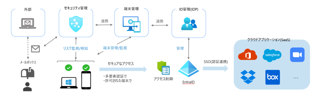 Microsoft 365 をご利用のお客様へ以下必須ともいえるセキュリティ製品の導入と設計をトータルで対応いたします。以下は基本的な構成図となっているため、他セキュリティ製品の導入についてもご支援可能です。