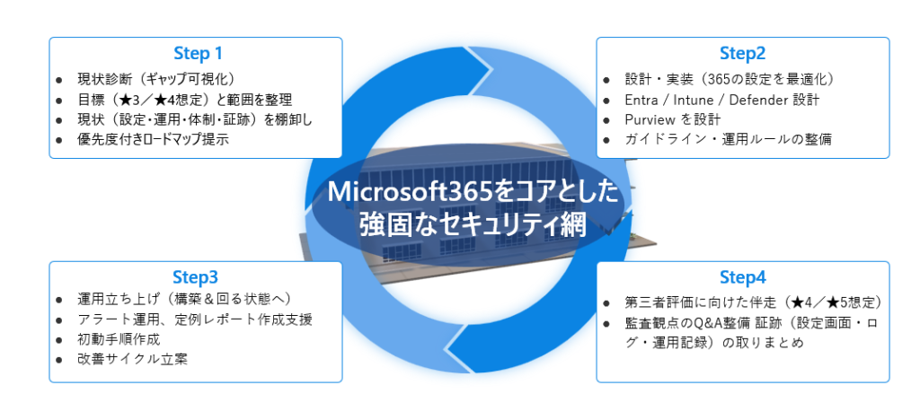 | Step 1 現状診断(ギャップ可視化) 目標(★3/★4想定)と範囲を整理 現状(設定・運用・体制・証跡)を棚卸し 優先度付きロードマップ提示 |